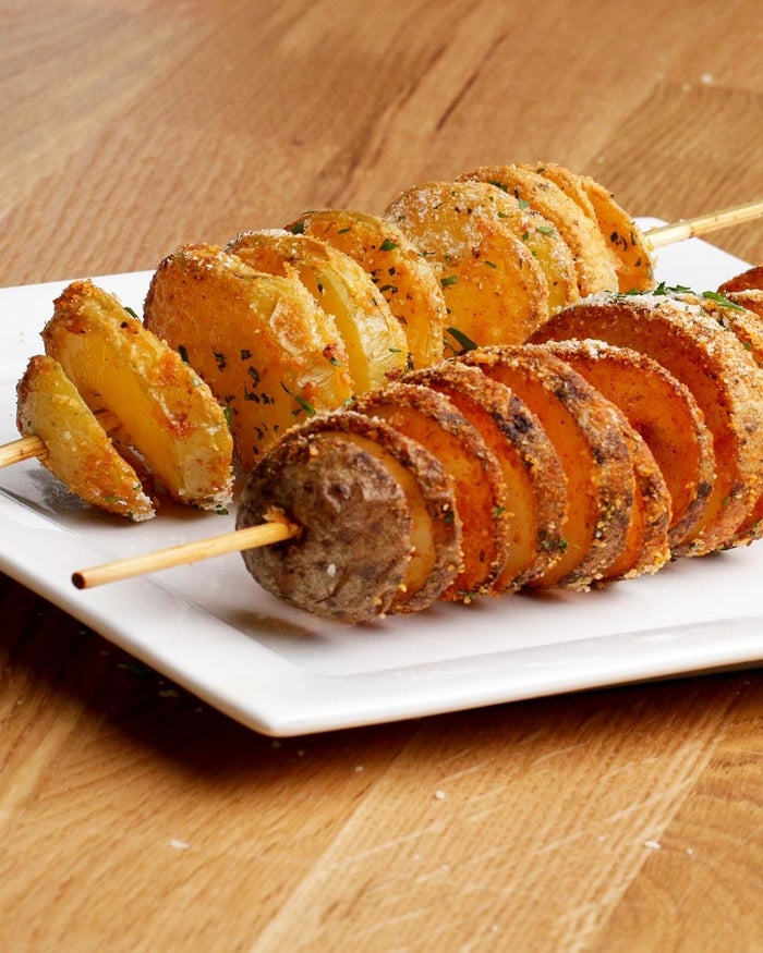 4. Dê espaço entre as fatias da batata no palito até obter espaço suficiente para formar a espiral.